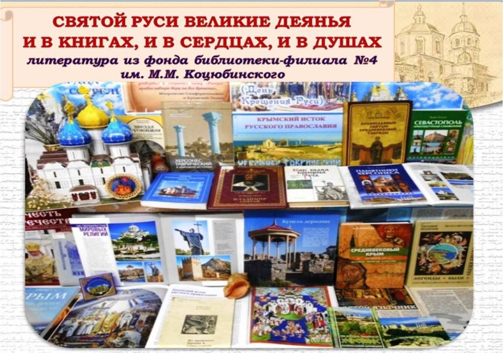 «Именно здесь, в Крыму, в древнем Херсонесе, или, как его называли русские летописцы – Корсуни, принял крещение князь Владимир, а затем крестил всю Русь». Эти наполненные гордостью слова Президента России Владимира Путина стали цитатой-лейтмотивом обзора-экспозиции «Святой Руси великие деянья», приуроченного библиотекой-филиалом №4 им. М.М. Коцюбинского ЦБС для взрослых Симферополя ко Дню крещения Руси. С конца прошлого столетия этот праздник отмечается как отечественная памятная дата, установленная в честь «исторического события, оказавшего значительное влияние на общественное, духовное и культурное развитие народов России и на укрепление российской государственности». «Мы не только почитаем дату Крещения Руси, она живет в нашем сердце и в нашей душе» (Митрополит Симферопольский и Крымский Лазарь).