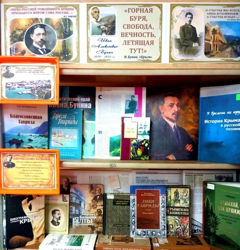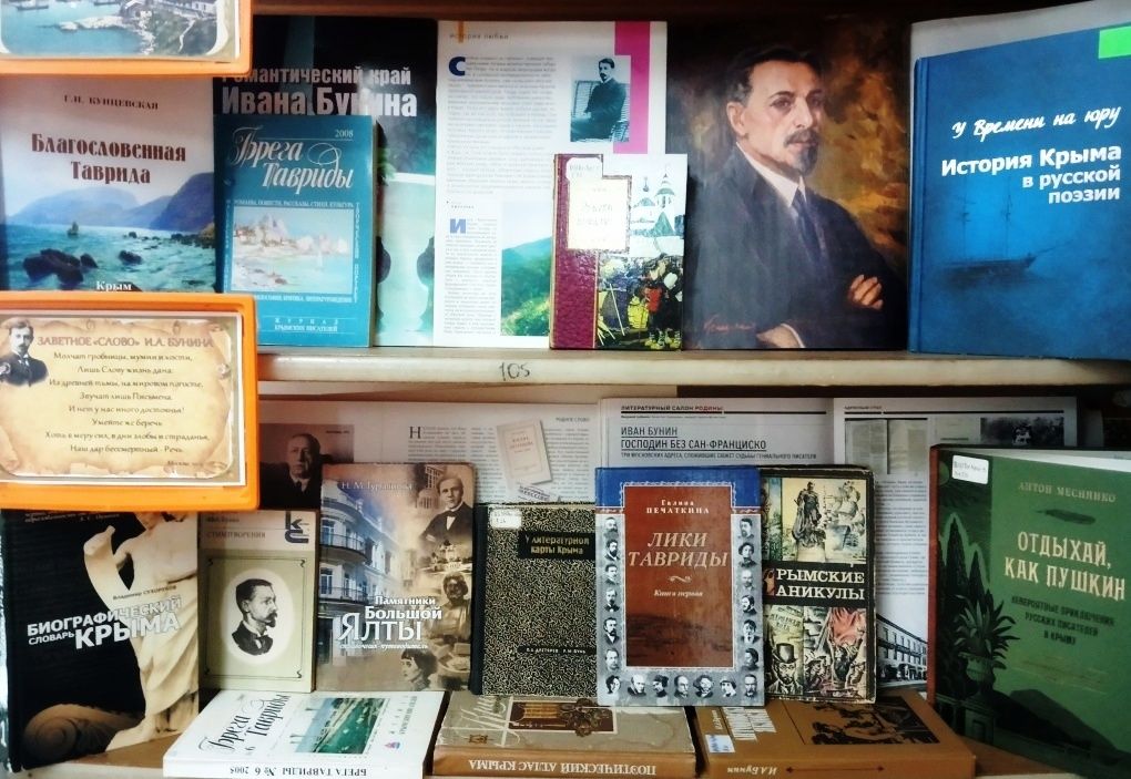 «У литературной карты Крыма» П. Дегтярева и Р. Вуля, «Лики Тавриды» Г. Печаткиной, «Биографический словарь Крыма» В. Сухорукова, «Русская Ривьера» А. Мальгина, «Благословенная Таврида» Г. Кунцевской, «У времени на яру. История Крыма в русской поэзии», «Отдыхай, как Пушкин. Невероятные приключения русских писателей в Крыму» А. Меснянко, другие краеведческие издания из фонда библиотеки знакомят с «крымскими страницами» биографии Ивана Алексеевича Бунина, впервые посетившего Крым в апреле 1889 года. Об этой поездке Бунин вспоминал: «В девятнадцать лет мне довелось побывать в этом романтическом крае. Все тогда в нем было чудно и необычно. И показавшийся тропическим город Севастополь, и нагой горный мир Балаклавы, и ночной глухой, будто из бездны, шум моря». Именно в свой первый приезд в Крым Бунин написал восторженные строки: «Пью, как студеную воду, горную бурю, свободу, вечность, летящую тут!». Впечатления тех дней нашли отражение в его автобиографических произведениях «Жизнь Арсеньева» и «Лика».