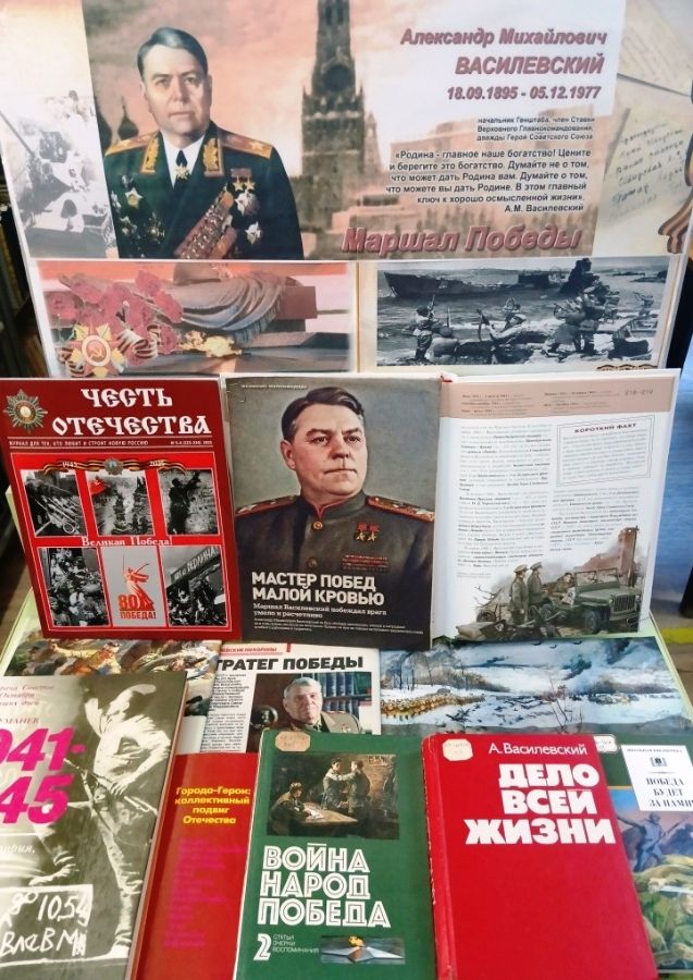 В преддверии этой знаменательной даты симферопольская библиотека-филиал №4 им. М.М. Коцюбинского представила вниманию своих читателей выставку-гордость «Маршал Победы. Александр Михайлович Василевский», ключевое место на которой заняли книга воспоминаний прославленного юбиляра «Дело всей жизни», энциклопедия «Полководцы России» Ю.К. Школьник, издание «1941-1945» Г.А. Куманева, статьи из журналов «Честь Отечества», «Родина», «Военная история», краеведческие историко-литературные материалы.