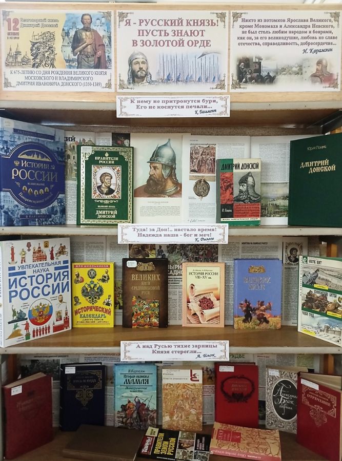12 октября исполняется 675 лет со дня рождения великого князя Владимирского и Московского Дмитрия Ивановича Донского, имя которого стало символом русской воинской доблести и славы. К этой значимой дате отечественной истории симферопольская библиотека-филиал №4 им. М.М. Коцюбинского подготовила выставку гордого имени «Я – русский князь! Пусть знают в Золотой Орде». Ее цитатой стало авторитетное высказывание о Дмитрии Донском историка Николая Карамзина: «Никто из потомков Ярослава Великого, кроме Мономаха и Александра Невского, не был столь любим народом и боярами, как он, за его великодушие, любовь ко славе отечества, справедливость, добросердечие».