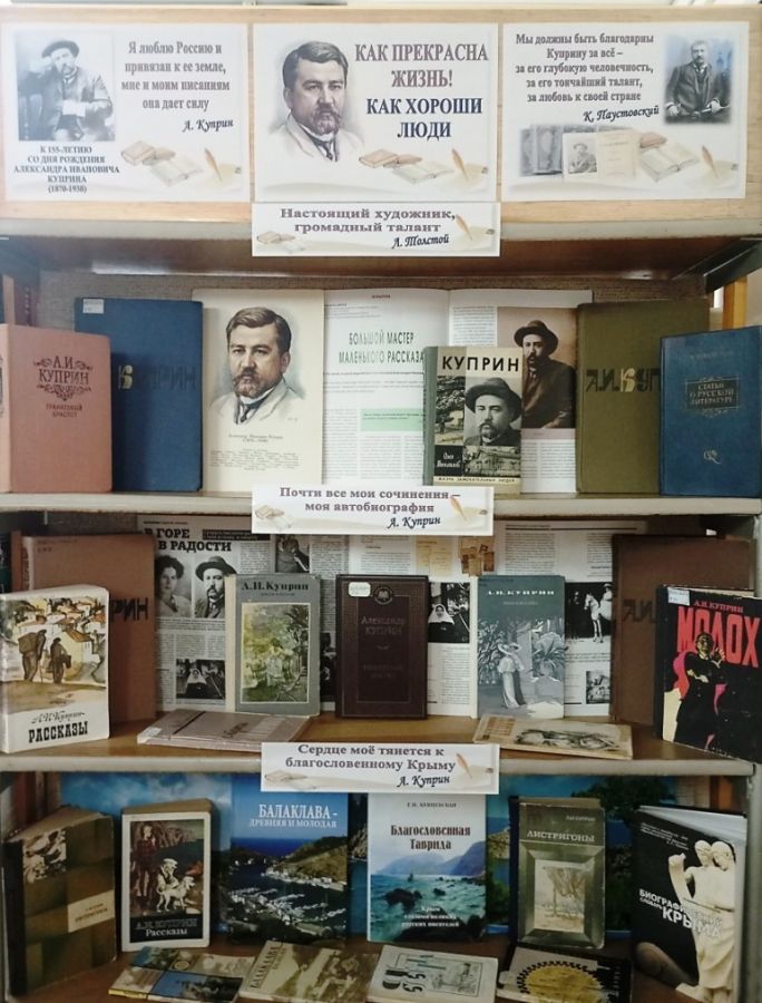7 сентября исполняется 155 лет со дня рождения одного из самых талантливых русских прозаиков, признанного мастера короткого рассказа Александра Ивановича Куприна. «Мы должны быть благодарны Куприну за всё – за его глубокую человечность, за его тончайший талант, за любовь к своей стране», – эти проникновенные строки Константина Паустовского выступили цитатой-лейтмотивом книжной выставки «Как прекрасна жизнь! Как хороши люди», приуроченной симферопольской библиотекой-филиалом №4 им. М.М. Коцюбинского к юбилею классика отечественной литературы.