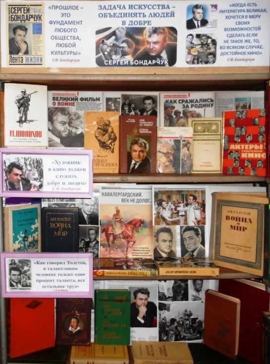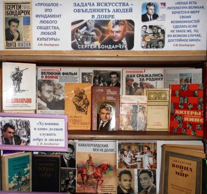Книжная выставка представляет вниманию читателей произведения отечественной классики, ставшие литературной основой созданных Сергеем Федоровичем любимых многими поколениями кинозрителей художественных фильмов: «Война и мир» и «Отец Сергий» Л. Н. Толстого, «Борис Годунов» А. С. Пушкина, «Князь Серебряный» А. К. Толстого, «Тихий Дон», «Они сражались за Родину» и «Судьба человека» М. Шолохова. «Молодая гвардия» А. Фадеева, «Повесть о настоящем человеке» Б. Полевого, «Сережа» В. Пановой. Не случайно современники С. Бондарчука отмечали, что «во всех его фильмах авторами являются писатели: Л. Толстой, А. Чехов, М. Шолохов... И далее, уже в титрах, обозначается: «экранизация С. Бондарчука».