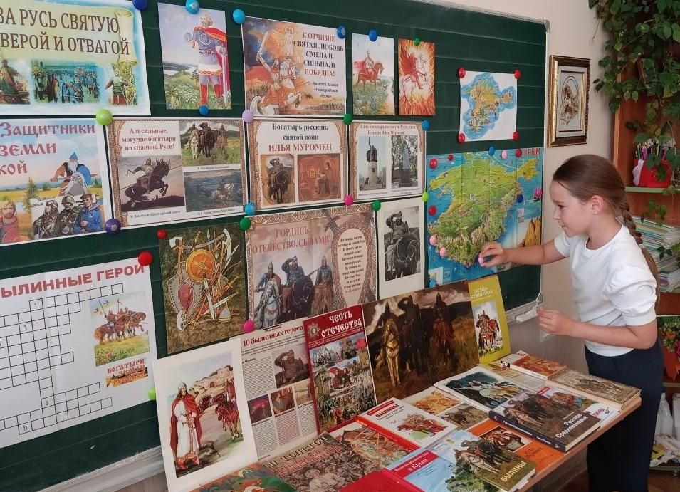 «Как говорится в былинах, / Когда на Русь надвигалась беда, / Выходили на поле брани / Три воина-богатыря. / Вот и сейчас мир рухнул… / И предпочтя автомат мечу, / Солдаты, родные по духу, / Вышли плечом к плечу», – с этих строк стихотворения «Богатыри России» Ольги Казаковой с юными крымчанами началась беседа о том, что и сегодня на защите Отечества стоят настоящие Герои-Богатыри, участники специальной военной операции.